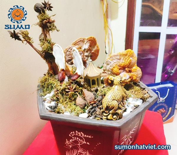 Hơn nữa, bonsai nấm tại SUMO đều có những thế dáng độc đáo của màu đỏ và vàng, mang nhiều ý nghĩa về mặt phong thủy. Người dùng có thể đặt trong chậu với một số chi tiết để hoàn thiện một tác phẩm bonsai có thể trưng bày, biếu tặng rất ý nghĩa.