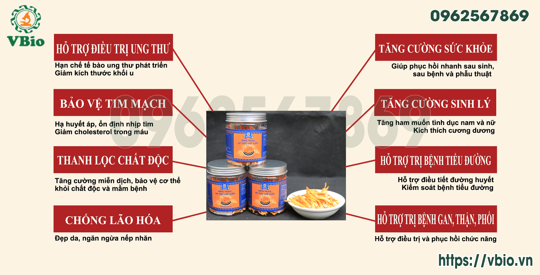 + Đông trùng hạ thảo làm ức chế sự phát triển, lây lan của tế bào ung thư, giảm kích thước khối u. Bổ sung năng lượng để người bệnh có đủ sức khỏe để thực hiện các đợt hóa trị, xạ trị.